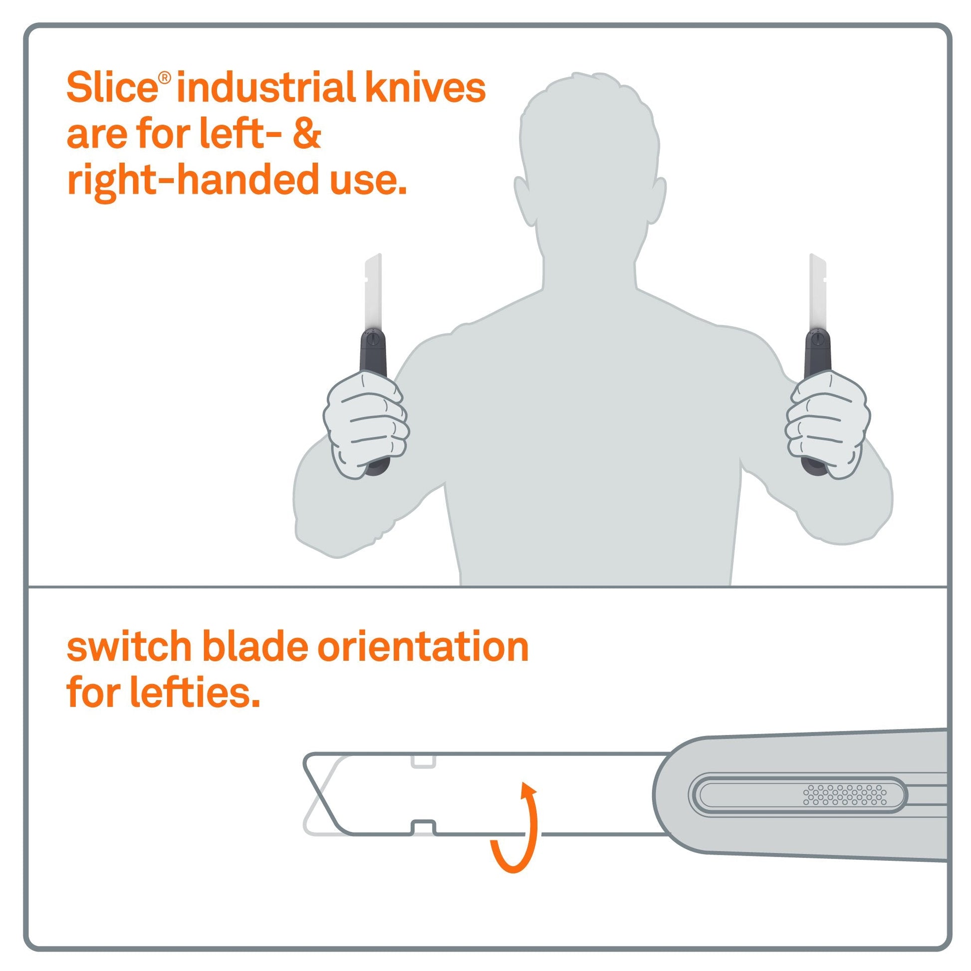 The Slice® Auto-Retractable Industrial Knife is a long-lasting, heavy-duty tool that keeps your frontline workers safe. The knife’s blade is the safest you’ll find in the workplace. Its unique finger-friendly® blade is safe to the touch and therefore causes fewer and less severe injuries than all other traditional blades. Auto-retraction adds another level of protection, as the blade can never be accidentally left out. The deep-cutting extra-long blade, which extends up to 3” (7.6 cm), and durable reinforced nylon handle make it ideal for industrial use. This hardwearing knife is suitable for left- and right-handed workers, and an integrated lanyard hole and quick-release no-tool blade changing help increase your workforce’s productivity.